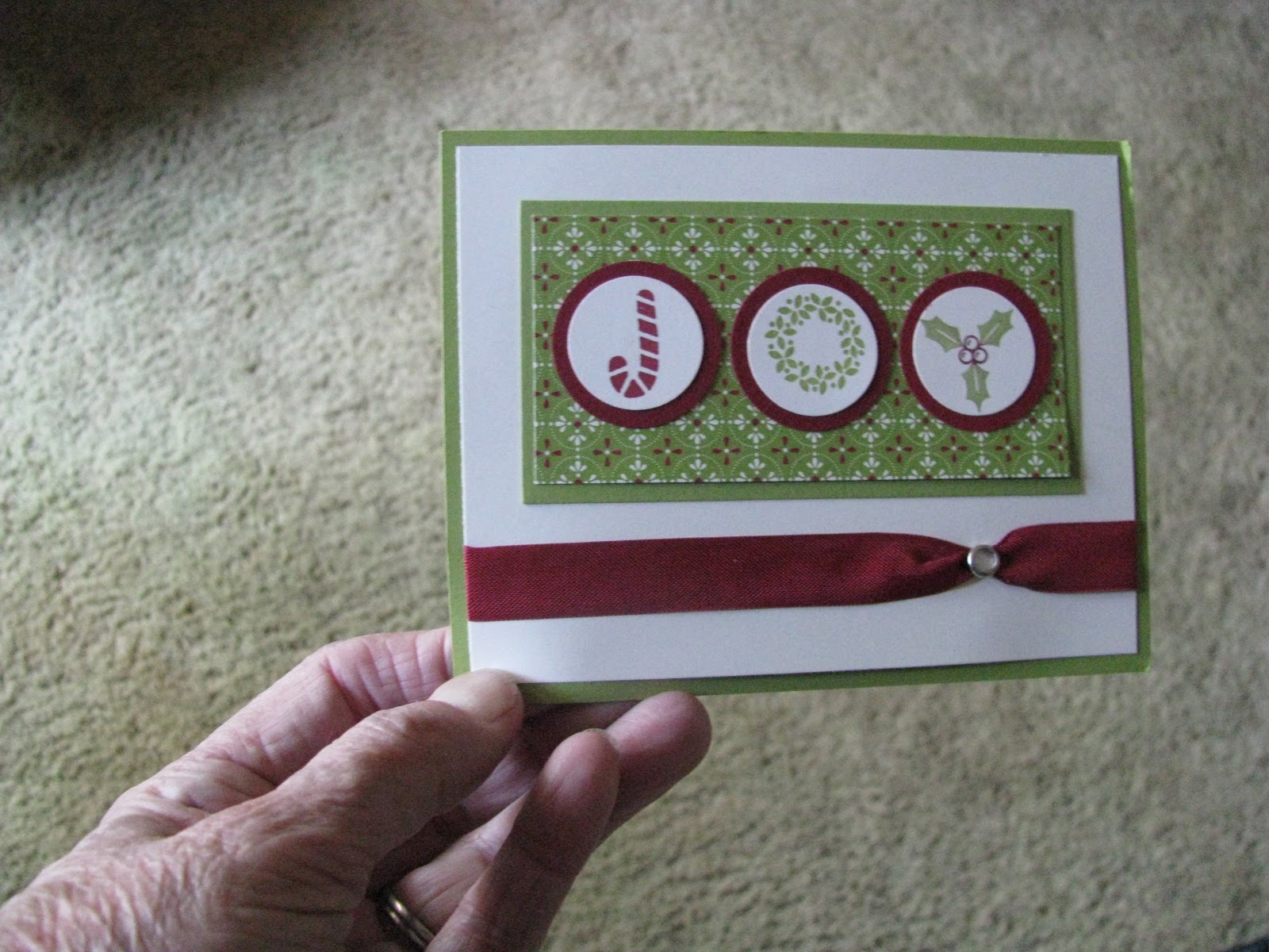 This is the card from a different angle. The card below was done by Angela Muranda-Clark. I love the "crispness" of this card. Looks like a great card to do for a Christmas "stamp-a-stack" or a M&T for a 1 hour workshop. Thanks for stopping by. Happy Stamping! |